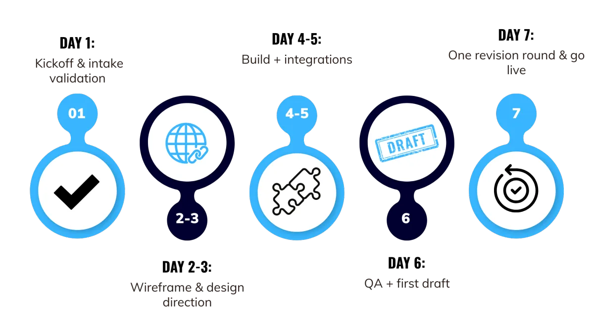 Annual pre-pay clients will receive the first draft in 7 days from complete intake or within 2 weeks if you pay month-to-month. You’ll get one revision round before launch.